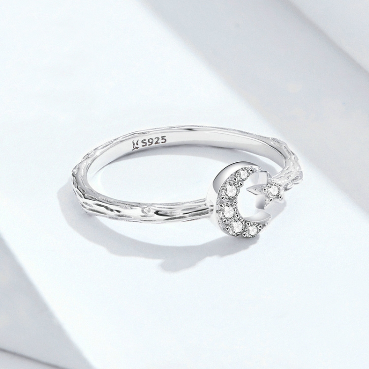 Fashion Retro Open Ring Sterling Silver S925 Star and Moon Platinum Plated Zircon Ring