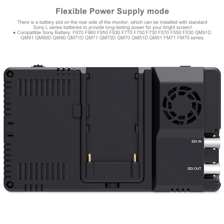 2. There is a large bright touch screen on the front, a signal interface on the left, an SD card slot at the bottom, and an NP-F battery on the back. There are standard 1/4-inch mounting points on the bottom and right side, which can be used to mount to cameras and other equipment