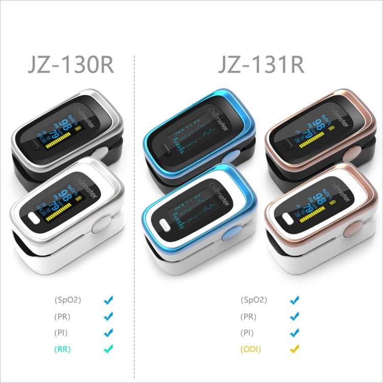 2. Display parameters: blood oxygen SPO2 value, pulse PR value, blood oxygen bar graph, pulse waveform graph, PI (perfusion index), respiratory rate monitoring parameter (130R), sleep monitoring parameter (131R)