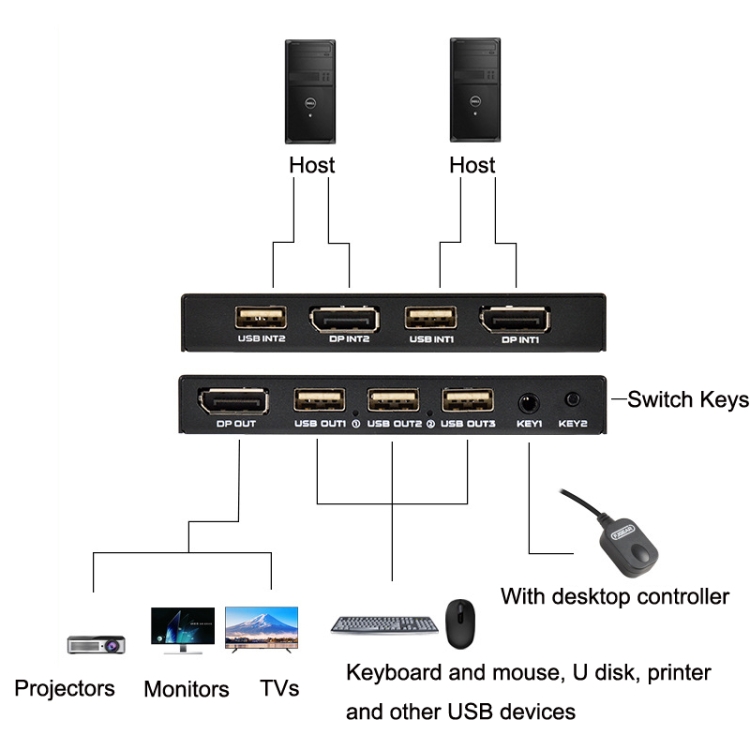 1. KVM switcher: Two hosts share a set of keyboard and mouse monitors with a desktop controller for convenient switching
