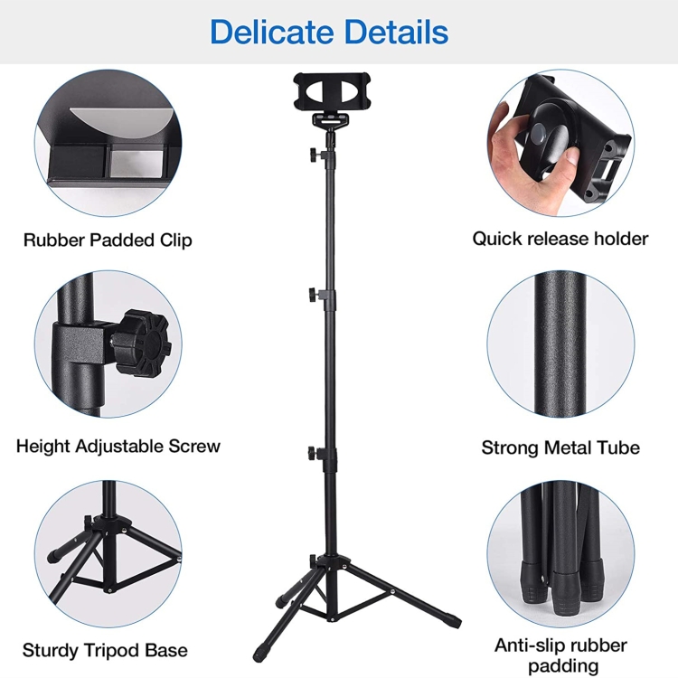 1.【360 Degree Rotation Freedom】The tablet holder can be rotated 360-degree, making it easy to switch your tablet from portrait mode to landscape mode. The top part of tripod stand also allows for wide needs of different scenarios with 270-degree swivel function.
