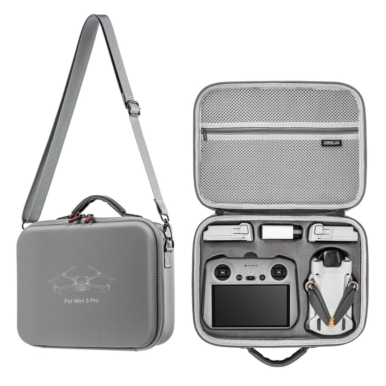 1. Specially designed for DJI Mini 3 Pro, precise mold opening, small size and large capacity, can accommodate remote control with screen + charger + 2 batteries + aircraft + other small accessories (accessories not included)