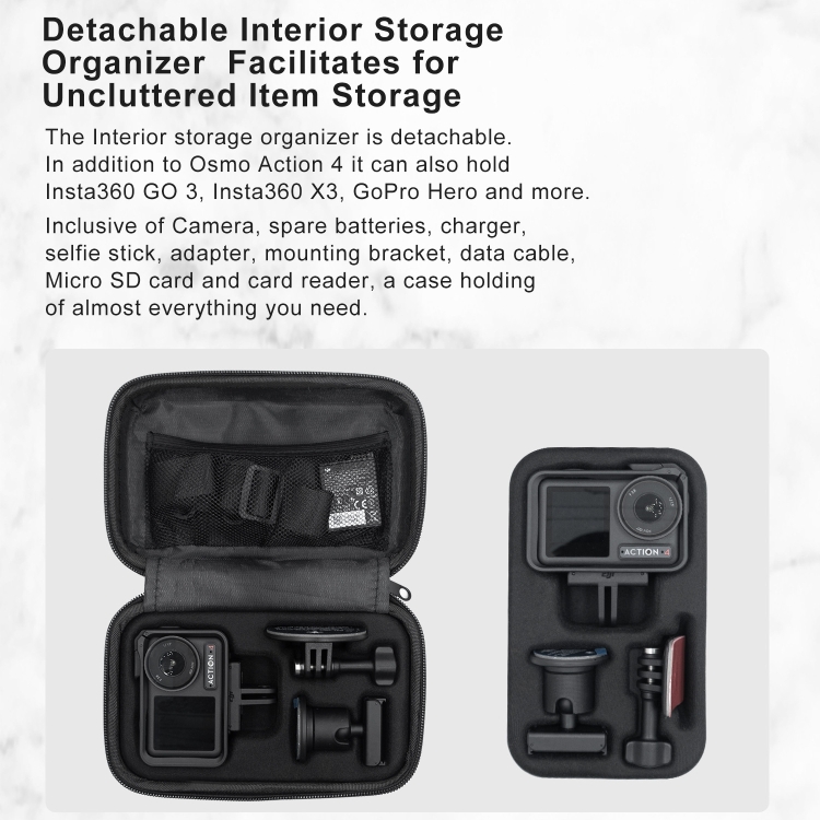 3. Removable inner tray, after the inner tray is taken out, it is compatible with GoPro Hero, GoPro MAX, Insta360 X3 / GO3 / GO2 / ONE RS, etc.
