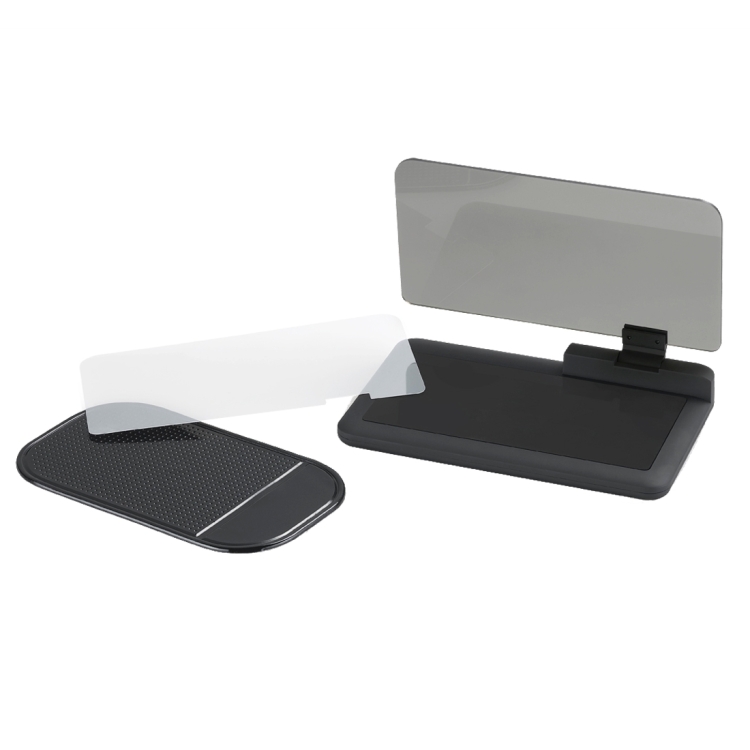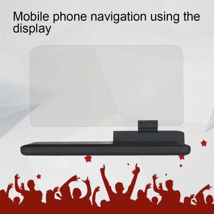 1. Smartphone HUD holder exploits the hardened organic glass to prevent scratch and project navigation information onto the panel based on optical reflection theorem. When placed on the center console, drivers do not need to bow to see because it will not block sight. Thus drivers could pay more attention to the road conditions nearby. In the meanwhile, the design avoids the drivers observing the distant road conditions, which makes the navigation information more visualized and thereby improves the driving safety.