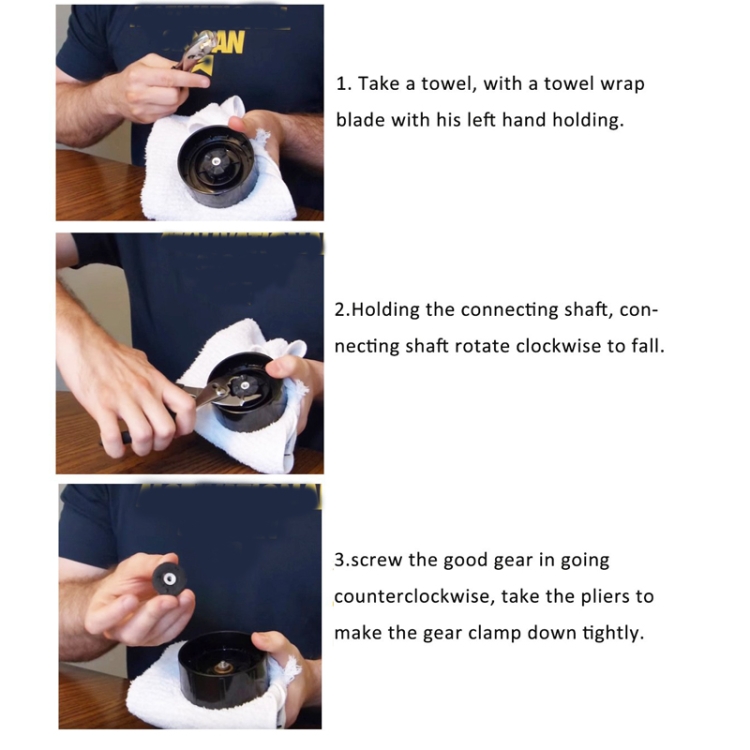 5. Easy to install: 1. Take a towel and wrap it with your left hand holding the towel blade. 2. Hold the connecting shaft with your right hand, rotate the connecting shaft clockwise and drop it. 3. Tighten counterclockwise when installing