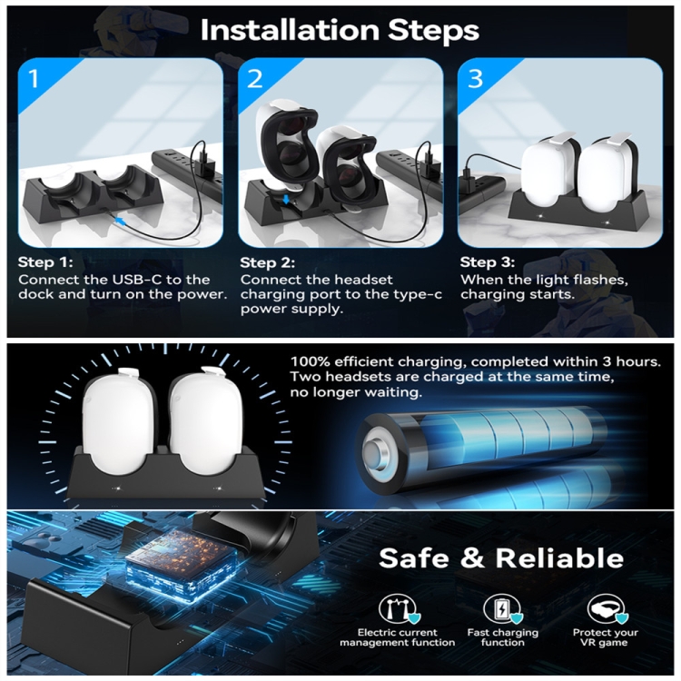 2.Safety Smart Chip,This oculus charging base uses a smart chip with current management function and fast charging mode. Make sure the current and voltage are within the proper range to effectively protect your VR game from damage during charging, fast charging while ensuring safe performance.