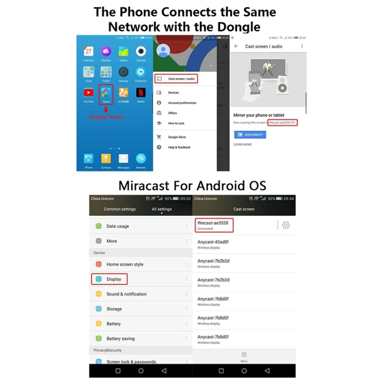 3. Wecast: Support Android netflix and youtube mirroring, Android 4. Youtube: Casting by wifi or mobile data ,Other apps can be worked by casting or mirroring