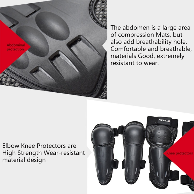 6. Size: armor suit about 43×33 cm, knee pads about 30×15 cm, elbow pads about 26×9 cm