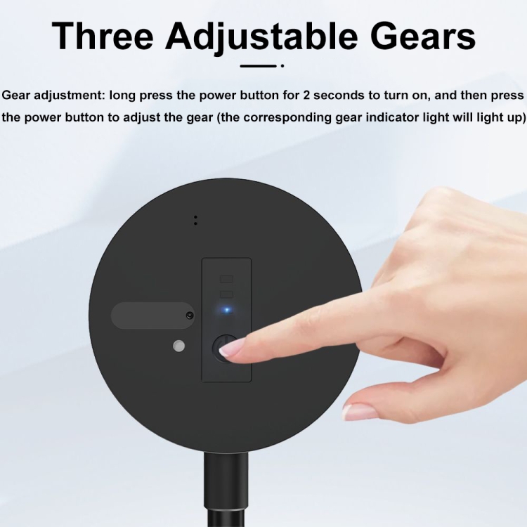 3. Three gears adjustable, long press the power button for 2 seconds to turn on, and then press the power button to adjust the gear (the corresponding gear indicator light will light up)