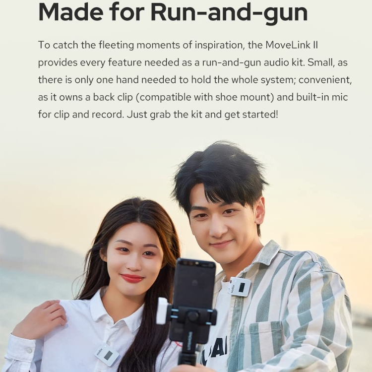 1. Made for Run-and-gun: To catch the fleeting moments of inspiration, the MoveLink II provides every feature needed as a run-and-gun audio kit. Small, as there is only one hand needed to hold the whole system; convenient, as it owns a back clip (compatible with shoe mount) and built-in mic for clip and record. Just grab the kit and get started!