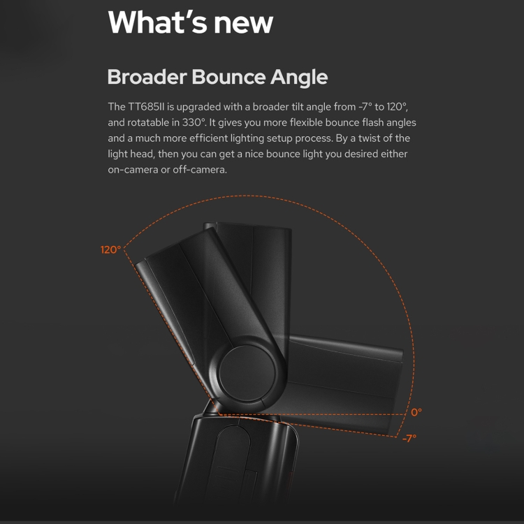 5. New changes & compatibility: The TT685II has been upgraded with a larger tilt angle, from -7 degrees to 120 degrees, and can be rotated 330 degrees. And adopts quick release lock design to ensure smooth installation.
