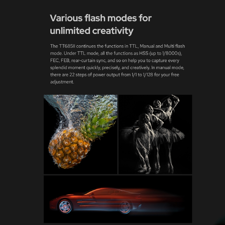 3. Powerful functions: TT685II has HSS (up to 1/8000s), FEC, FEB, rear curtain sync and other functions in TTL mode. In manual mode, there are 22 levels of power output from 1/1 to 1/128 for you to adjust freely. Meanwhile, TT685II has two zoom modes: Auto/Manual. Flash coverage is 20-200mm.