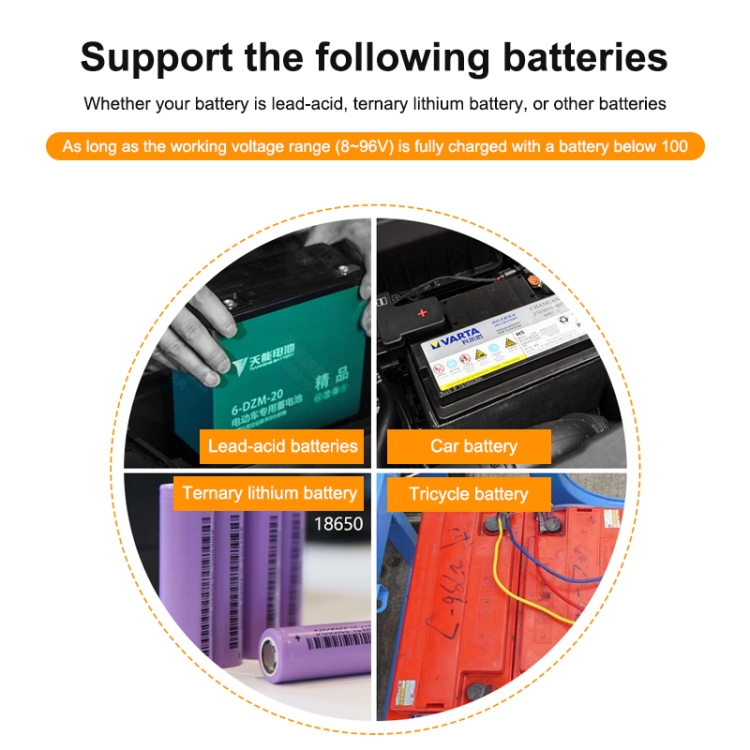5. Suitable for: 3-27 x 3.7V Lithium Batteries; Lead Acid Batteries 12V, 24V, 36V, 48V, 60V, 72V, 84V