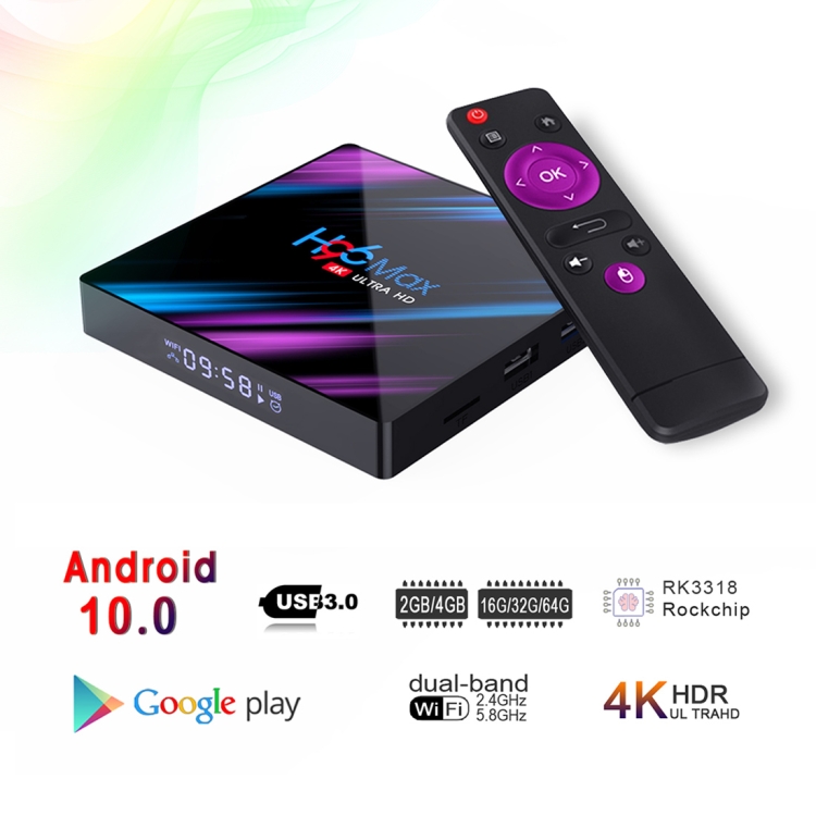 H96 Max-3318 4K Ultra HD Android TV Box with Remote Controller, Android 10.0, RK3318 Quad-Core 64bit Cortex-A53, 4GB+32GB, Support TF Card / USBx2 / AV / Ethernet