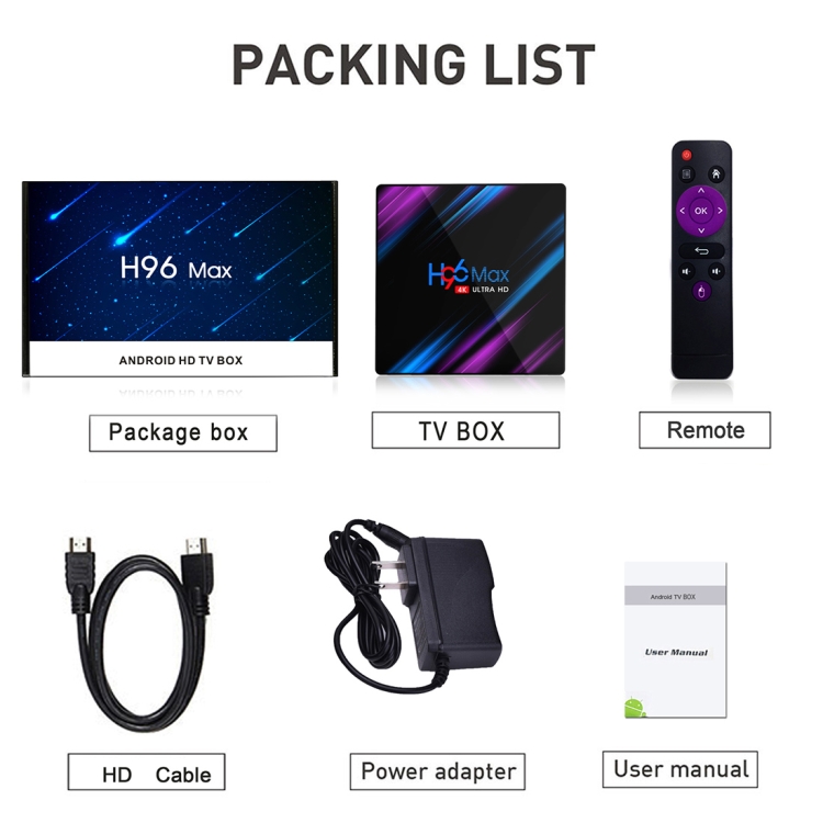 Power adaptor x1,HDMI cable x1,user manual x1,remote control x1