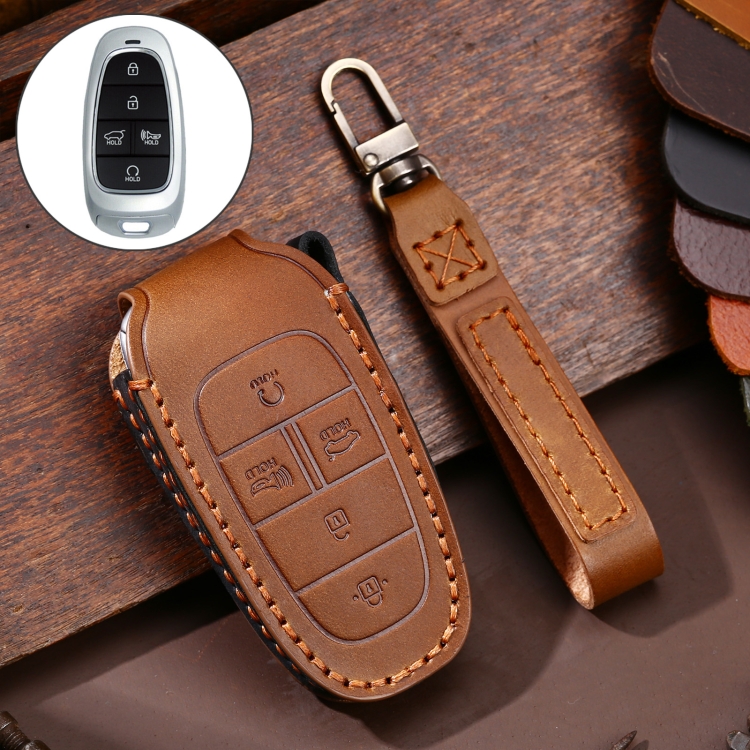 Hallmo Car Cowhide Leather Key Protective Cover Key Case for Hyundai 5-button