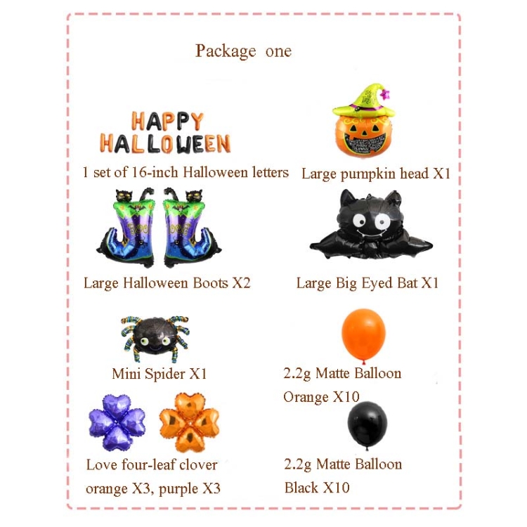 5. Set 1: 1 set of 16-inch Halloween letters, large pumpkin head X1, large Halloween boots X2, large big-eyed bat X1, mini spider X1, love four-leaf clover orange X3/purple X3, 2.2g matte balloon orange X10, 2.2g matte balloon black X10