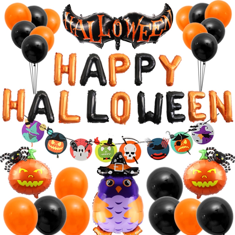 8. Set 4: 16-inch Halloween letters x1 set, skull pattern pull flag x1 set, English bat x1, large owl wizard x1, large pumpkin spider x2, small ribbon black x1 roll, 2.2 grams matte balloon black x10, 2.2 keya light balloon orange x10