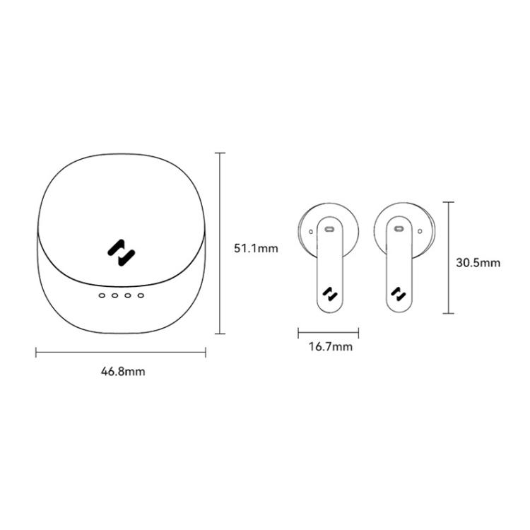 11. Product size: earphones 30.5 x 16.7mm, charging case 51.1 x 46.8mm