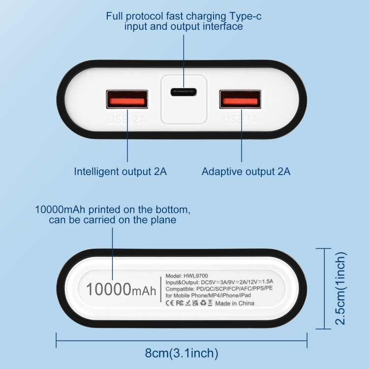 6. The bottom is printed with a capacity of 10,000 mAh, which is safe for flight travel.