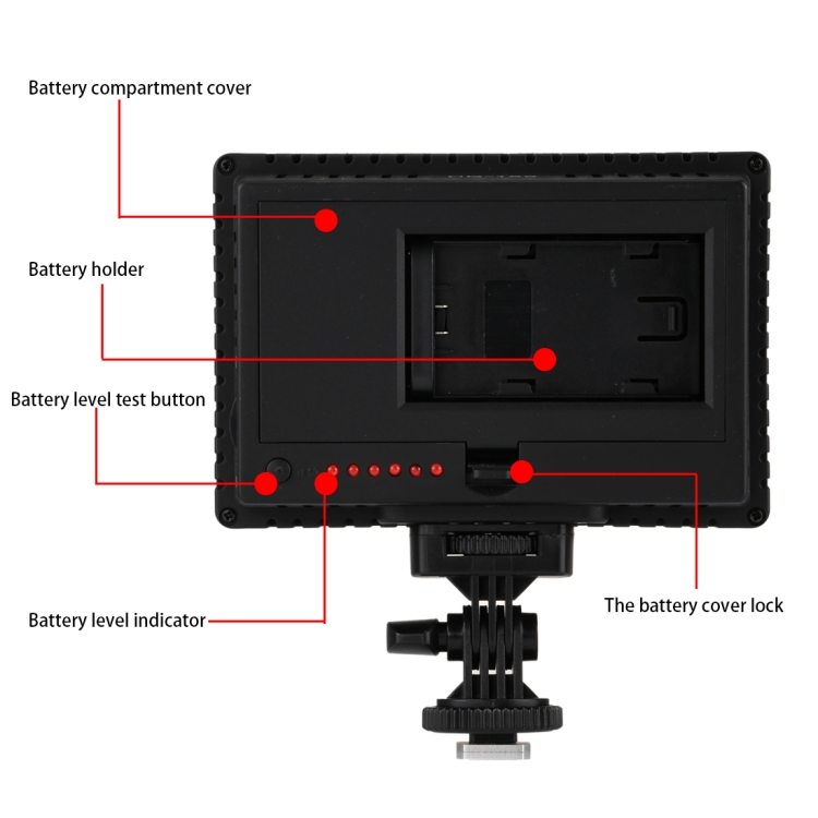 9. Can be fixed in the camera hot shoe socket, professional light frame or camera tripod use, can also be hand-held.