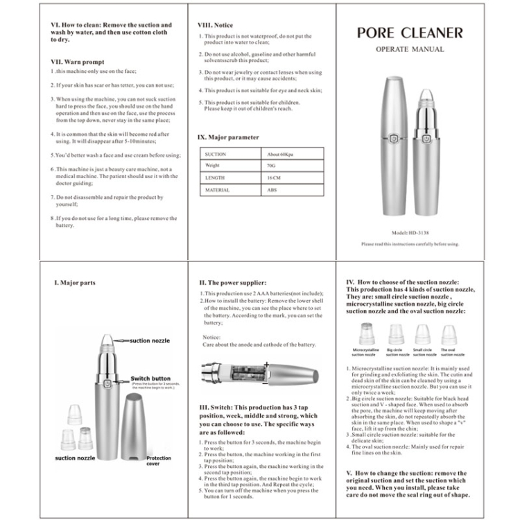 3. 2 x AAA batteries, provide Buler suction (the product does not contain batteries)