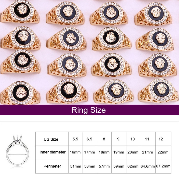 Hip Hop 18K Gold Plated Lion Head Rhinestone Ring for Men, US Size: 12, Inner Diameter: 22mm, Perimeter: 67.2mm