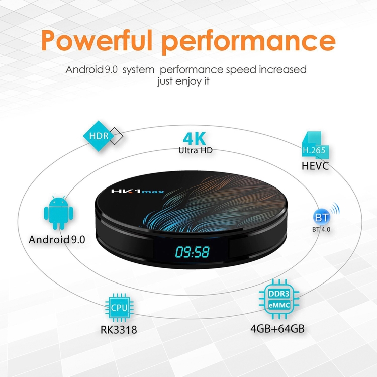 HK1max 4K UHD Smart TV Box with Remote Controller, Android 9.0 RK3318 Quad-Core 64bit Cortex-A53, 2GB+16GB, Support Dual Band WiFi & AV & HDMI & RJ45 & TF Card
