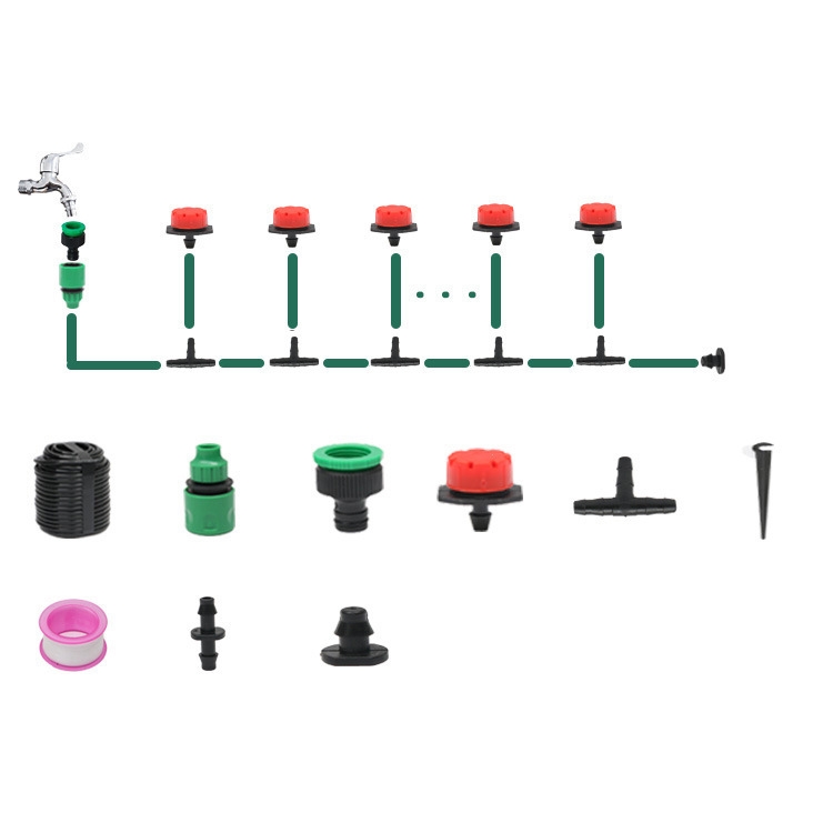 -20m kit: 4/7mm tube x 25m, quick connector x 1, 46-point nipple x 1, eight-hole dripper x 30, 3-way tee x 30, fixing bracket x 30, teflon tape x 1 pc, straight x 2 pcs, end cap x 1