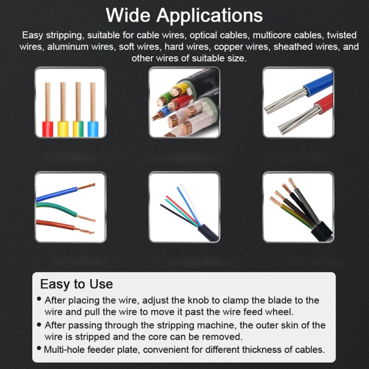 8. Wide range of applications, easy to strip, suitable for cable, fiber optic cable, multi-core cable, twisted pair, aluminum wire, soft wire, hard wire, copper wire, sheathed wire, and other wires of suitable size