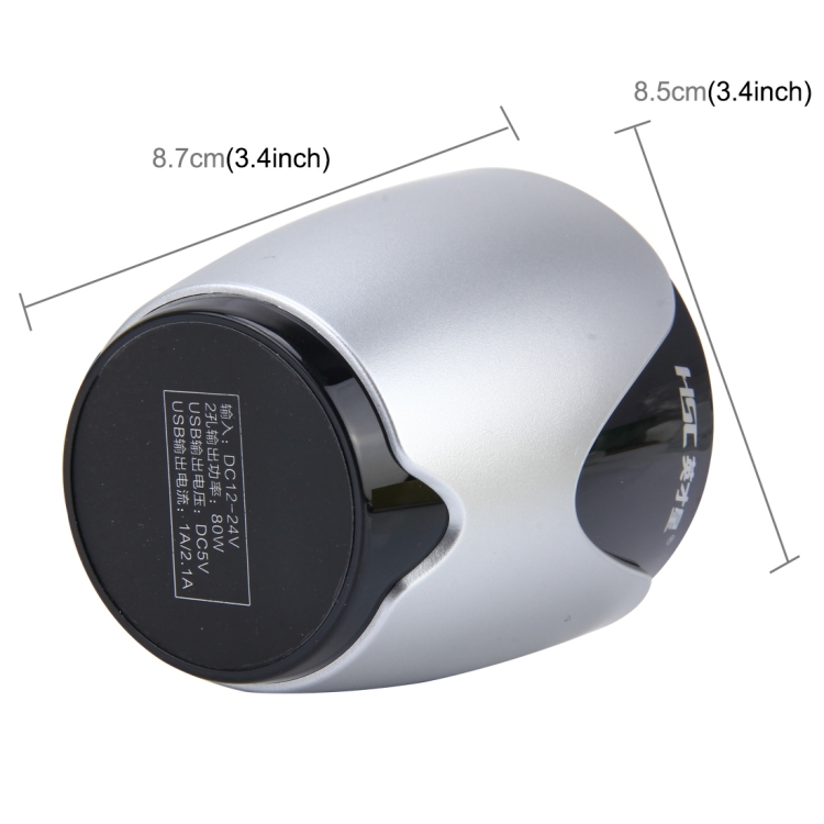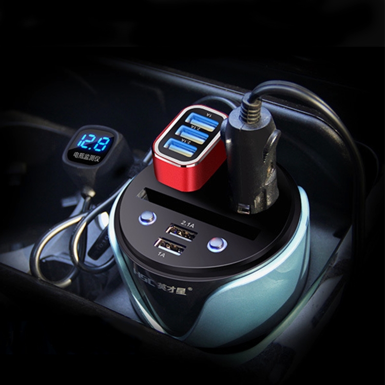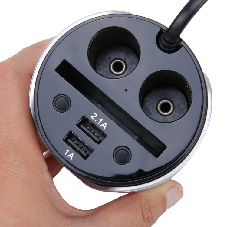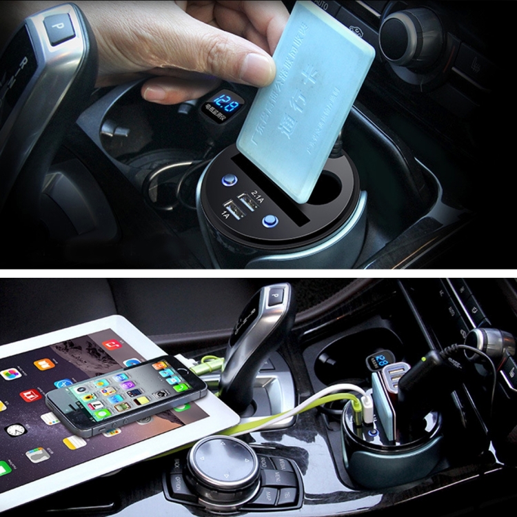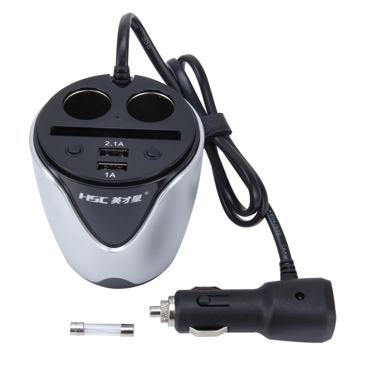 HSC YC-19D Car Cup Charger 2.1A/1A Dual USB Ports Car 12V-24V Charger with 2-Socket Cigarette, Card Socket and LED Display