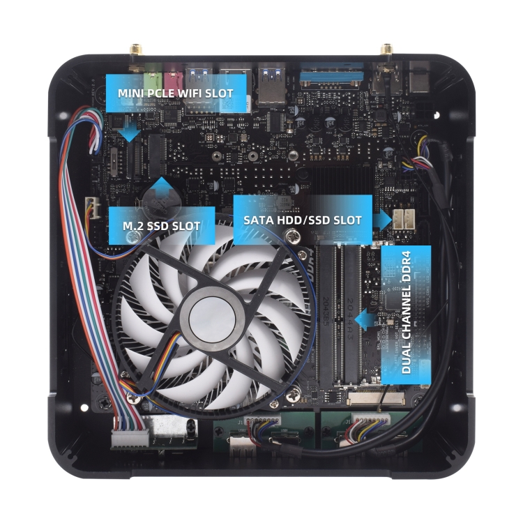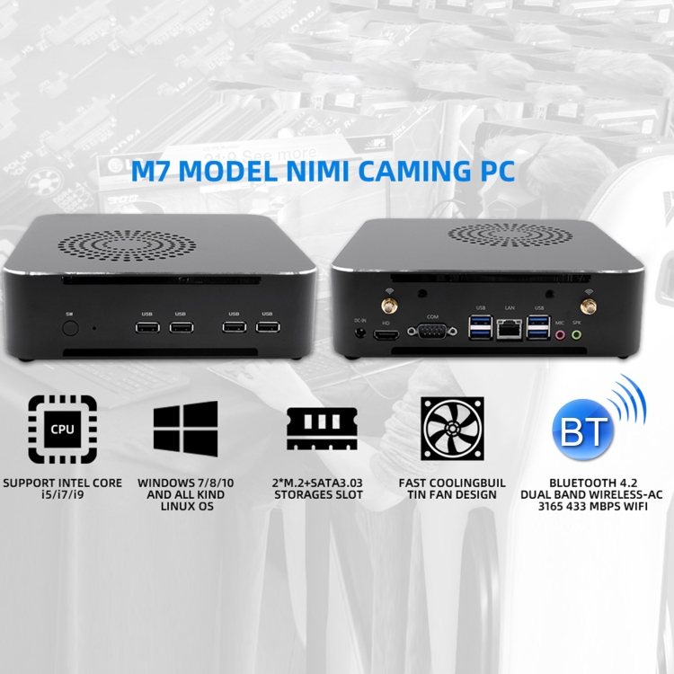6. Input/Output ports: 1xPower On/Off switch, 4xUSB3.1, 4xUSB2.0, 1xHDMI, 1xDC in, 1xRJ45, 1xSPK out, 1xMic in