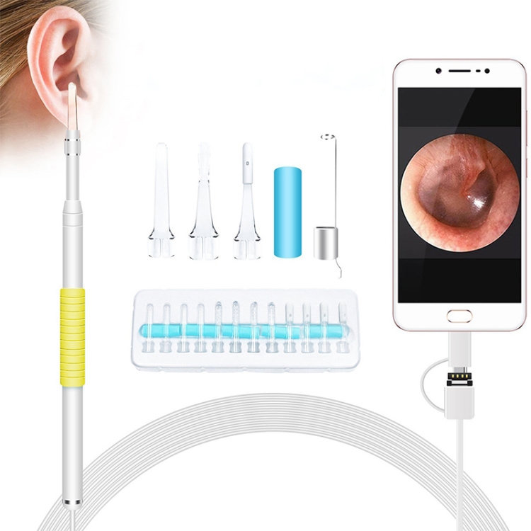 This is a HD visual ear canal cleaning tool that includes a mini camera whose diameter is 5.5mm and a few interchangeable accessories, with ear pick, adhesive ear pick, ear pick with cotton stick, earmuffs. Images can be displayed and saved on your phones or computers.