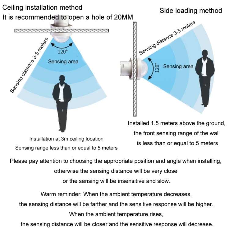 12. Warm reminder: When the ambient temperature decreases, the sensing distance will be farther and the sensitive response will be higher. When the ambient temperature rises, the sensing distance will be closer and the sensitive response will decrease.