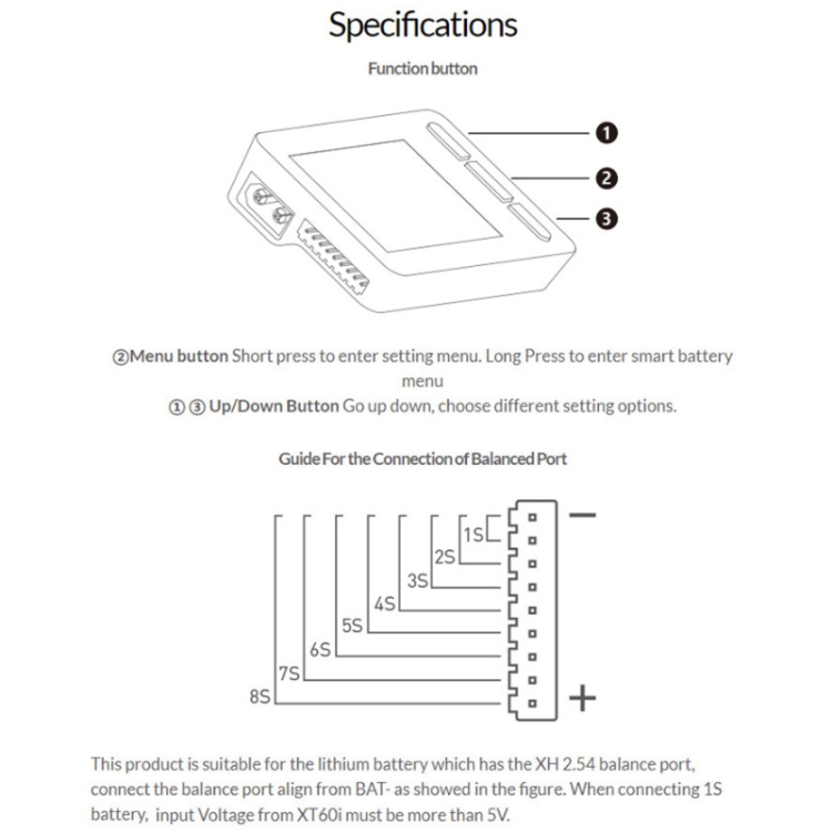 2. Balance port 1 string input voltage range: 0.8V-15V