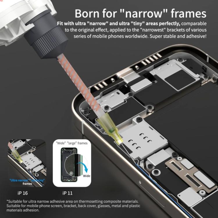 2. It is applied to narrow brackets of various series of mobile phones, suitable for ultra narrow adhesive area on thermosetting composite materials, such as mobile phone screen, bracket, back cover, glasses, metal and plastic materials.
