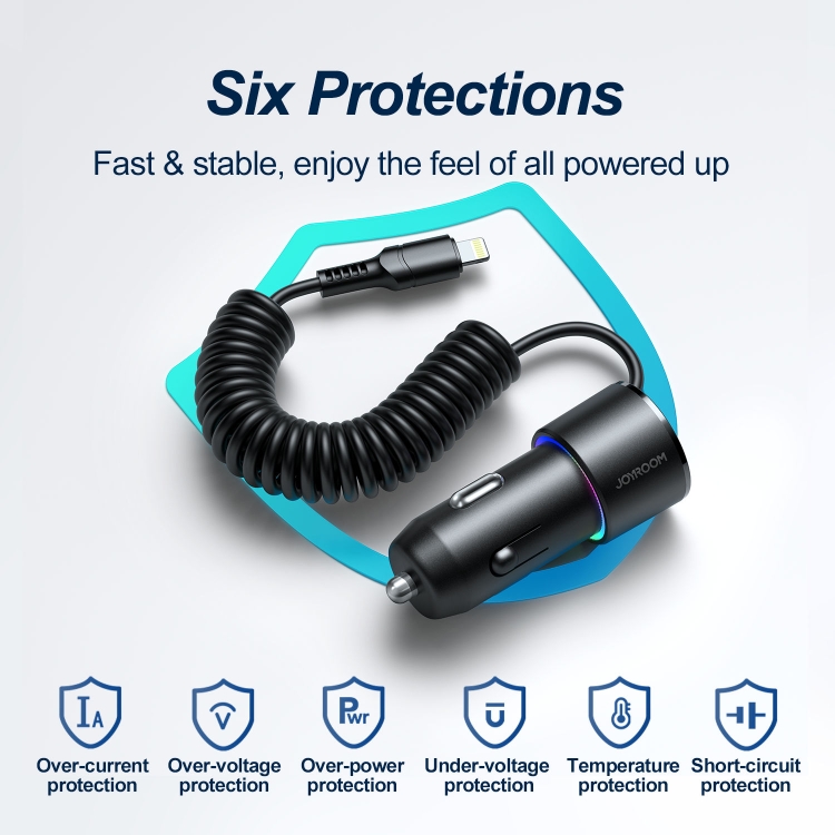 JOYROOM JR-CL25 3.4A 3-in-1 Car Charger with Coiled 8 Pin Cable