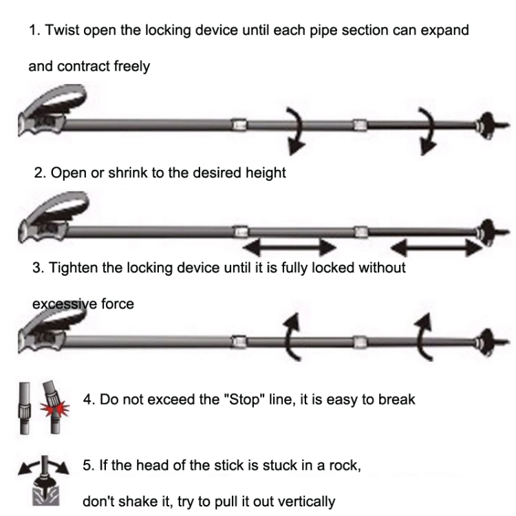 1. Twist open the locking device until each pipe section can expand and contract freely