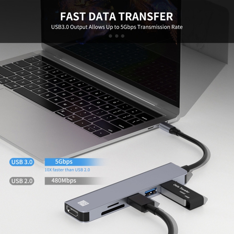 1. Extensive capability: 6-in-1 USB Type-C hub includes 1*Micro SD card reader, 1*TF card reader,1*USB 3.0 Ports, 2*USB 2.0 Ports, 1*4K HDMI video output.