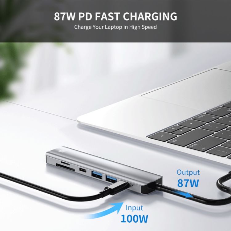 5.High-speed charging: Support PD charging at max 87W. This multiport USB C adapter provides one Type-C pass through Female port by which you could securely charge while connecting multiple peripherals for data transferring and worry-free power storage. (Ps: the Type-C PD charging port is only applicable to devices with PD Protocol)