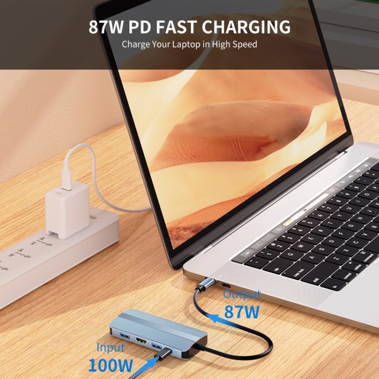 5.High-speed charging: Support PD charging at max 87W. This multiport USB C adapter provides one Type-C pass through Female port by which you could securely charge while connecting multiple peripherals for data transferring and worry-free power storage. (Ps: the Type-C PD charging port is only applicable to devices with PD Protocol)