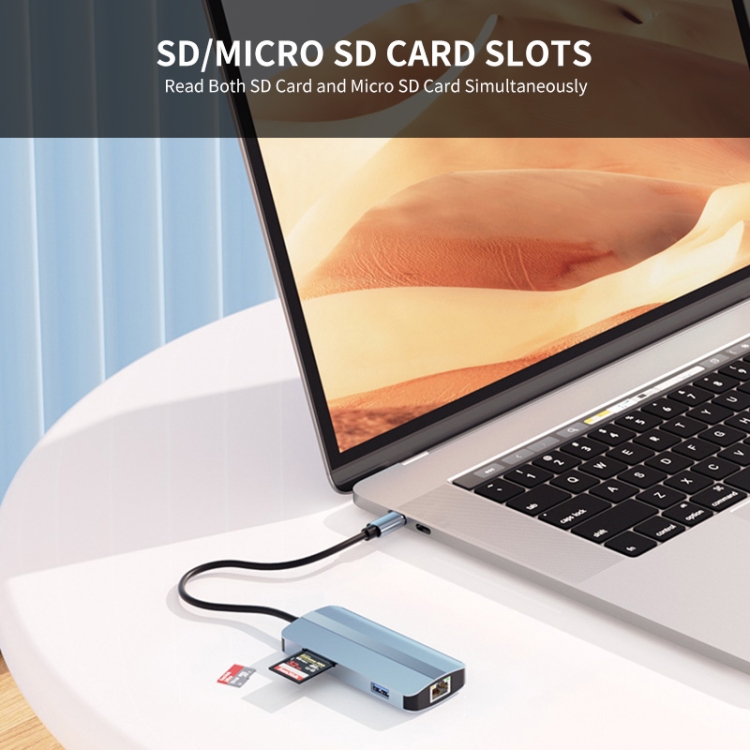 1. Extensive capability: 8-in-1 USB Type-C hub includes 1*Micro SD card reader, 1*TF card reader,1*USB 3.0 Ports, 2*USB 2.0 Ports,1*Type-C PD charging port, 1*4K HDMI video output,1*RJ45 Ethernet Port.