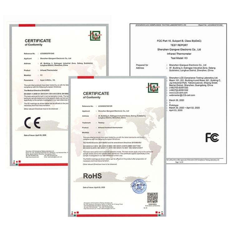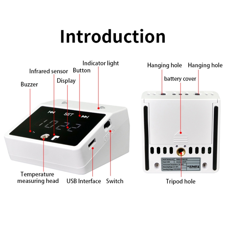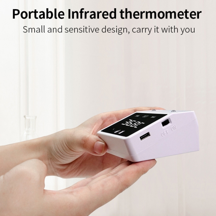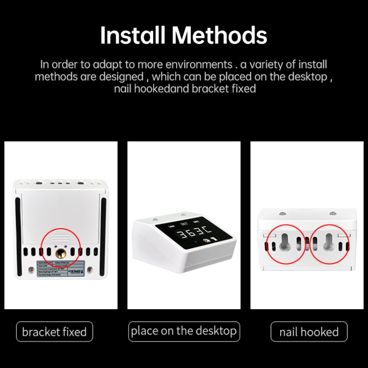 6. Intelligent infrared forehead thermometer, no need to hold, can be hung / placed on desk / bracket fixed.