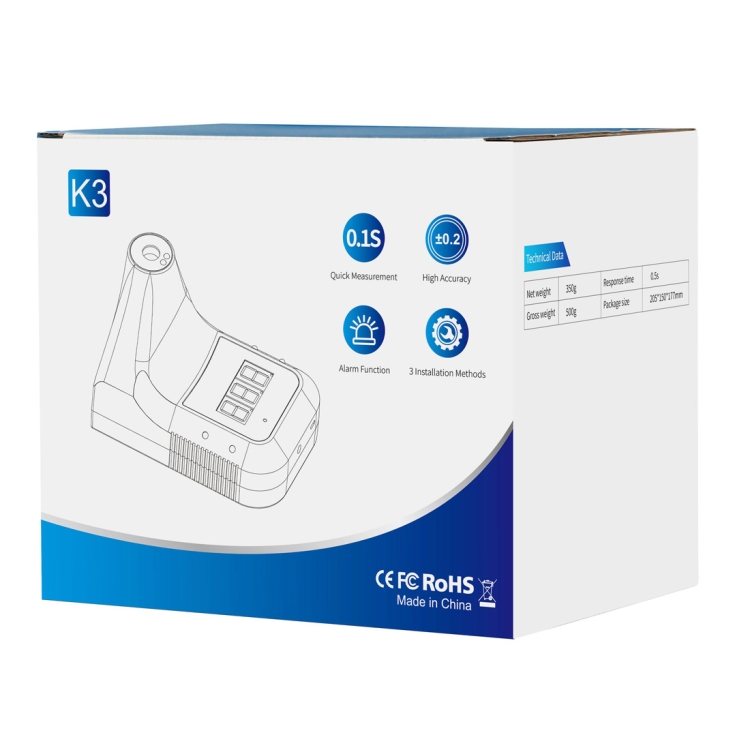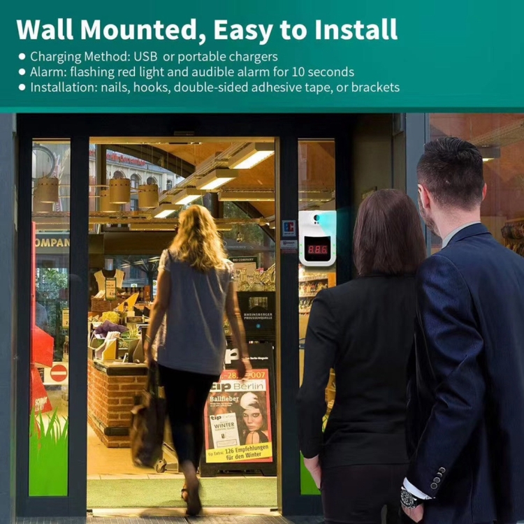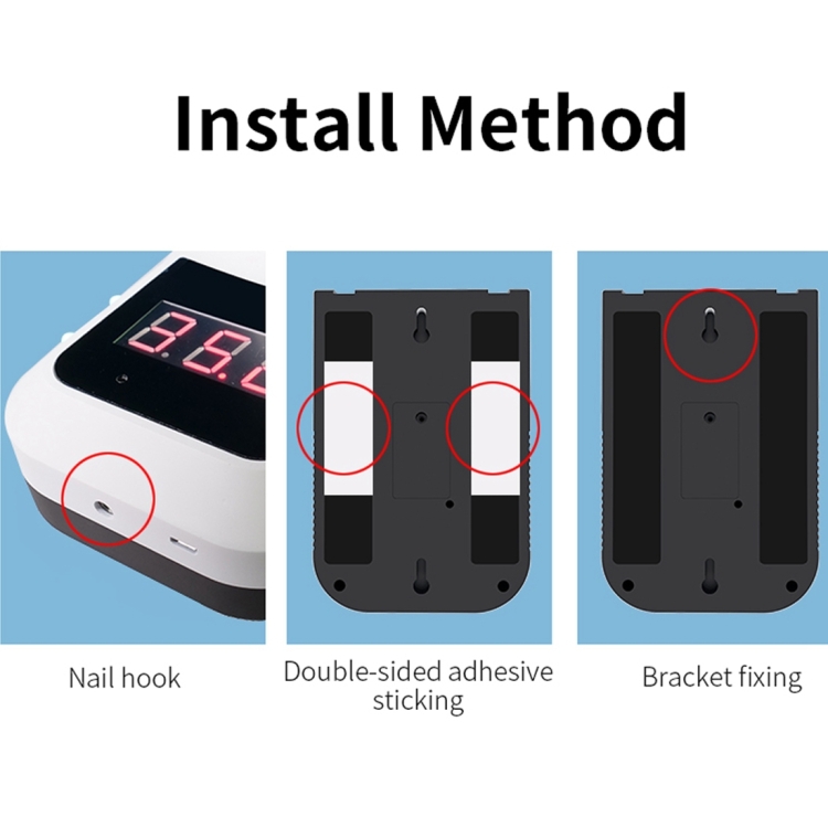 7. Intelligent infrared forehead thermometer, no need to hold, can be hung / double-sided adhesive tape / bracket fixed.
