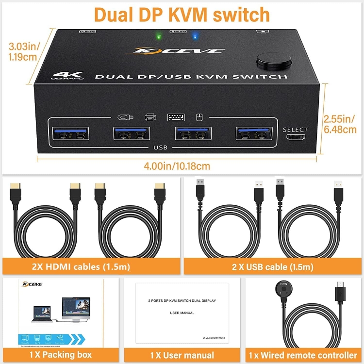 KC-KVM202DP 4K 60Hz USB3.0 DP Dual Monitors KVM Switch