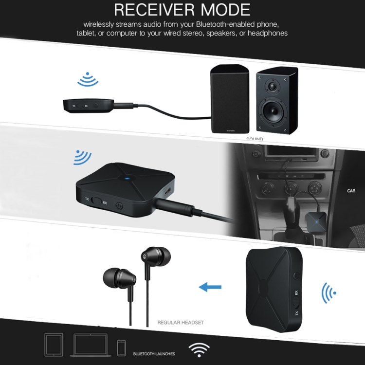 2. Transmitter mode: wirelessly streams audio from your non-Bluetooth TV, home stereo system, or CD player to your Bluetooth headphones or speakers