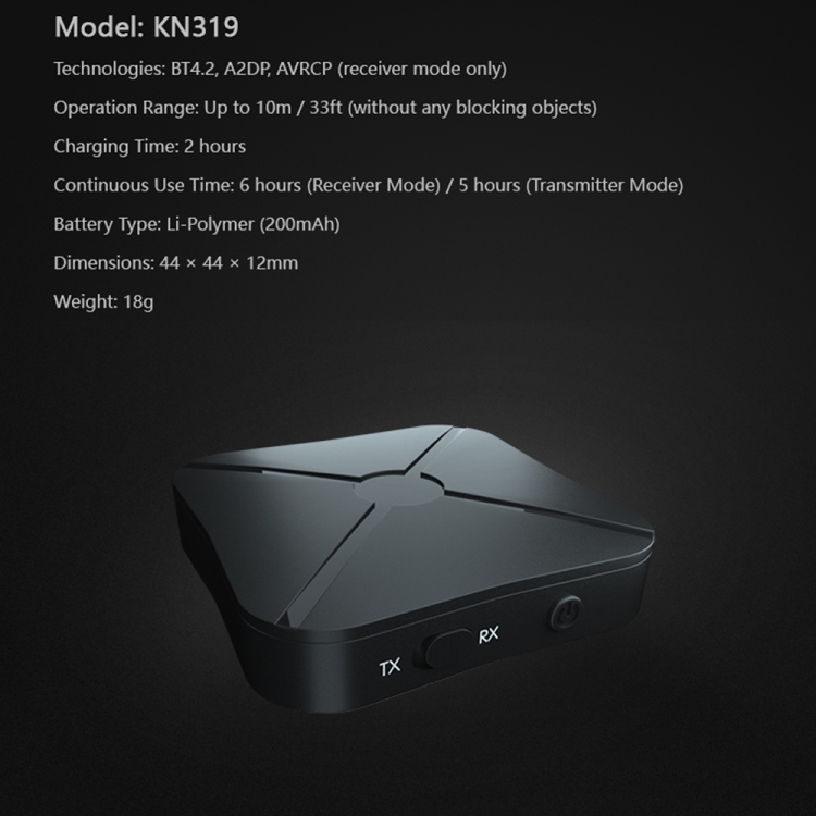 The KN319 is just 44mm (1.73 inch) across and weighs only 18g (0.63oz), but has got powerful wireless audio streaming capabilities. Slip this transmitter & receiver into your backpack or laptop bag and take it on-the-go without the slightest effort.