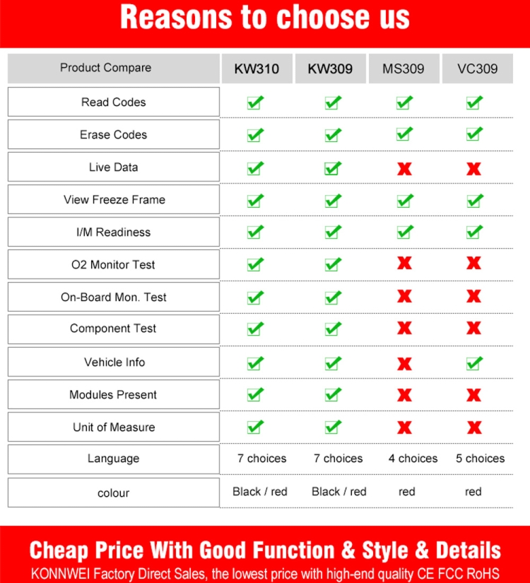 7. Views freeze frame dataThe KONNWEI KW310 OBD2 / EOBD / CAN Car Diagnostic Scanner supports all 10 OBDII test modes on all OBDII compliant vehicles for a complete diagnosis. the KONNWEI KW310 is truly the ultimate in power and affordability, allowing users to do their jobs faster.
