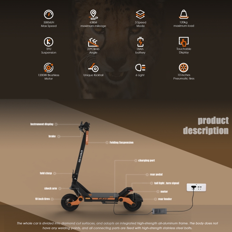 3. It is equipped with a formidable 1200W motor featuring dual heat dissipation technology. This motor provides a consistent and potent power output, propelling the e-scooter to speeds of up to 50km/h. The motor adopts a dual heat dissipation structure to maintain peak performance for longer.