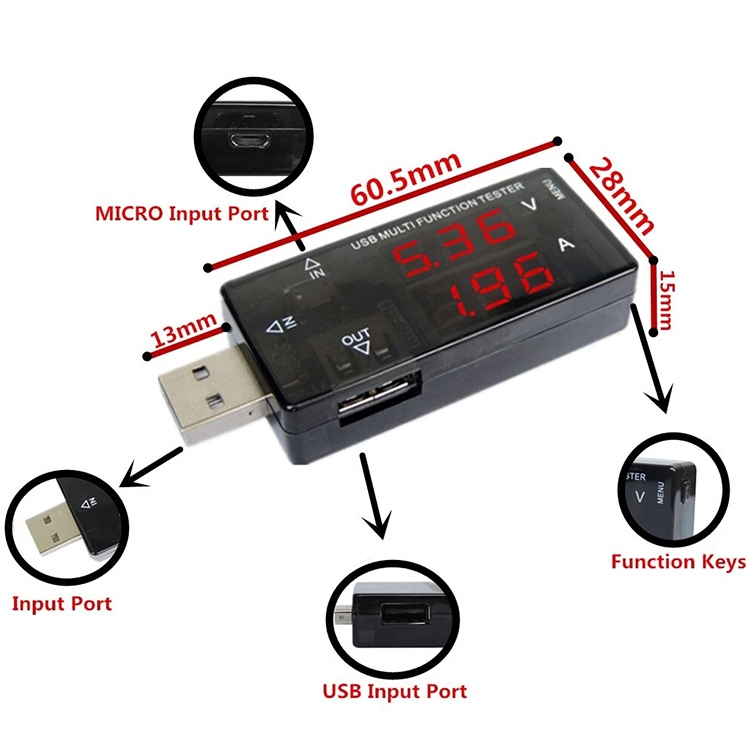 8. Connect the male USB plug to the 5V charger socket and connect to the mobile phone and other devices, and directly read the voltage and current parameters